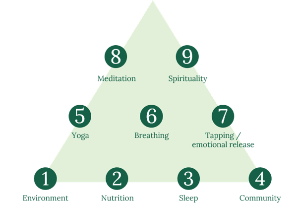 In our philosophy, we believe mastery of these 9 points of health are necessary to create one vibrant you, full of inner peace and joy: environment, nutrition, sleep, community, yoga/exercise, breathing, tapping/emotional release, meditation, and spirituality.
