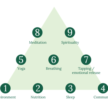 In our philosophy, we believe mastery of these 9 points of health are necessary to create one vibrant you, full of inner peace and joy: environment, nutrition, sleep, community, yoga/exercise, breathing, tapping/emotional release, meditation, and spirituality.
